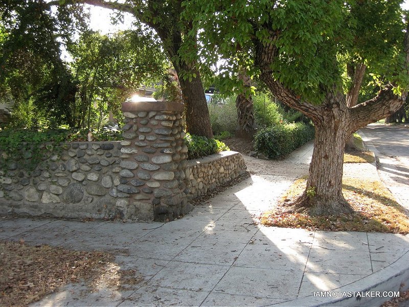 location I set out to stalk – the street where Jamie Lee Curtis and her friends walk home from school and Michael Meyes drives by in his station wagon – is also located in South Pasadena. The most recognizable part of the street where the girls walk is a large stone pillared half-wall located on a corner, which amazingly also looks EXACTLY the same thirty years later. Very cool!!! ๐ Big THANKS to Mike from