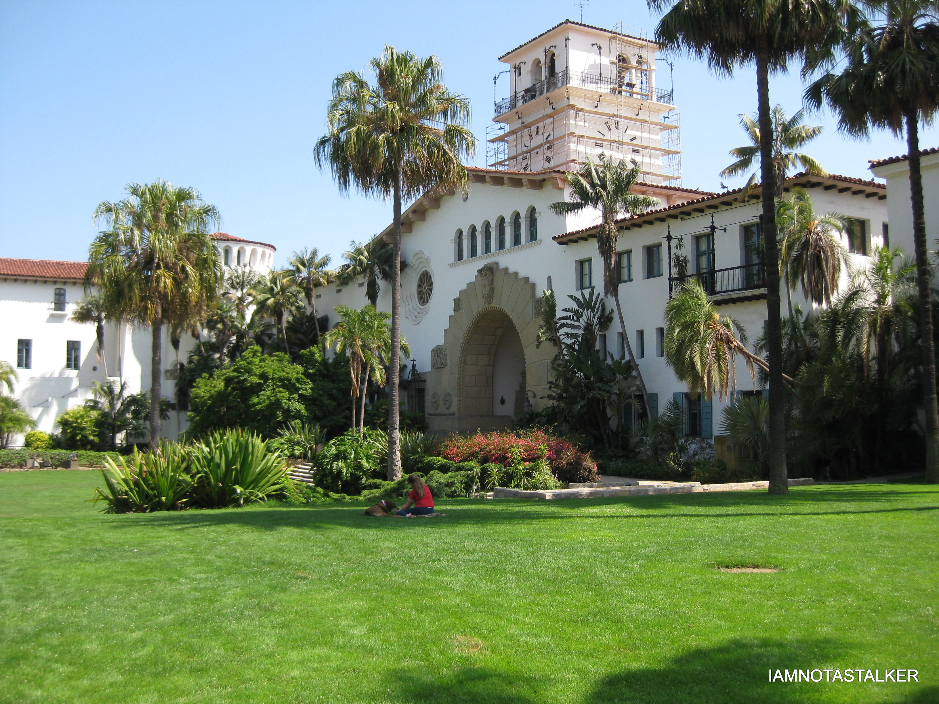 Two weekends ago, my fiancé and I headed up to Santa Barbara to spend the Fourth of July holiday with some friends. And just minutes before we left, fellow stalker Kerry texted me to let me know that the 2009 romantic comedy It’s Complicated had been filmed in the area, just in case I wanted to do some stalking while I was there. Well, let me tell you, I just about died upon hearing that and even though I had yet to see the movie, I spent the entire ninety minute drive up to Santa Barbara researching It’s Complicated filming locations on my blackberry so that we could stalk them as soon as we arrived. As it turns out, though, not all is at it seems, for while the movie was set in Santa Barbara, very little of it was actually filmed there. Oddly enough, over ninety percent of the flick was lensed in New York of all places! I was absolutely shocked when I heard that as I honestly can’t think of a place that is more diametrically opposed to Santa Barbara than New York City, aesthetically speaking at least. Anyway, one of the main Santa Barbara locations featured in the movie was the historic county courthouse, so I dragged my fiancé right over there pretty much immediately after we checked into our hotel.