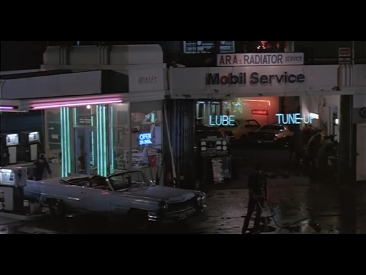 In L.A. Story, Harris K. Telemacher (Steve Martin) and Sara McDowel (Victoria Tennant) stop at the Gilmore Gasoline Service Station, where they ask for a “full service” treatment – their tank filled, car washed, and all four tires removed and exchanged LOL – before heading to a fund-raising dinner. As you can see in the screen captures pictured above, at the time that the movie was filmed in 1991, the gas station was an incredibly cool little place. I cannot express how disheartening it was to discover that a unique piece of Southern California’s history – one with historic cultural status, no less – has been allowed to deteriorate in such a way. As I said earlier, what a shame!